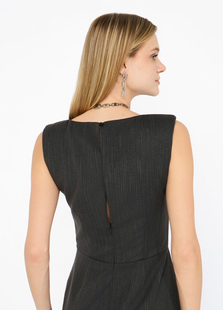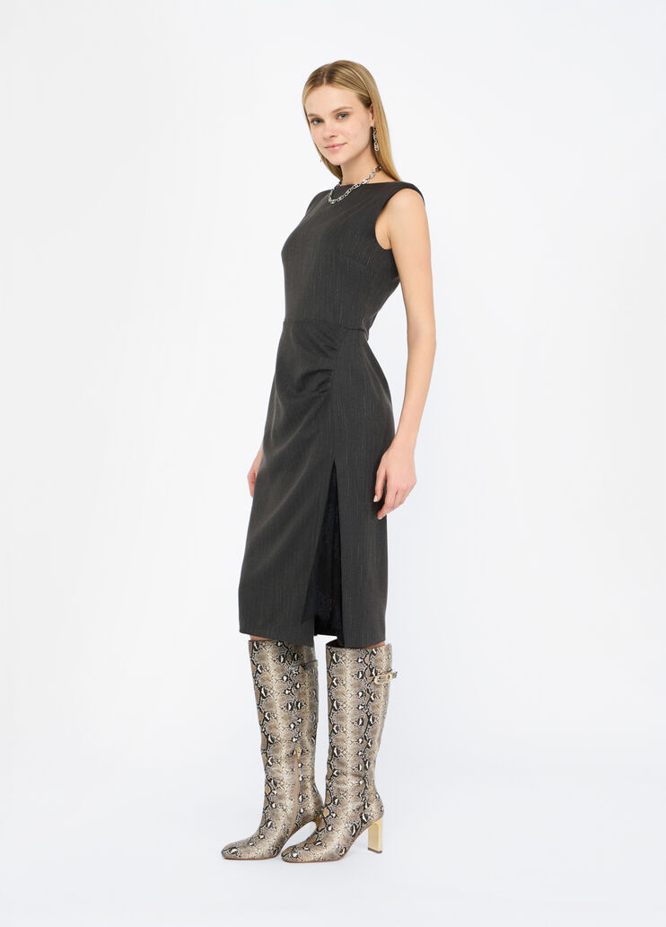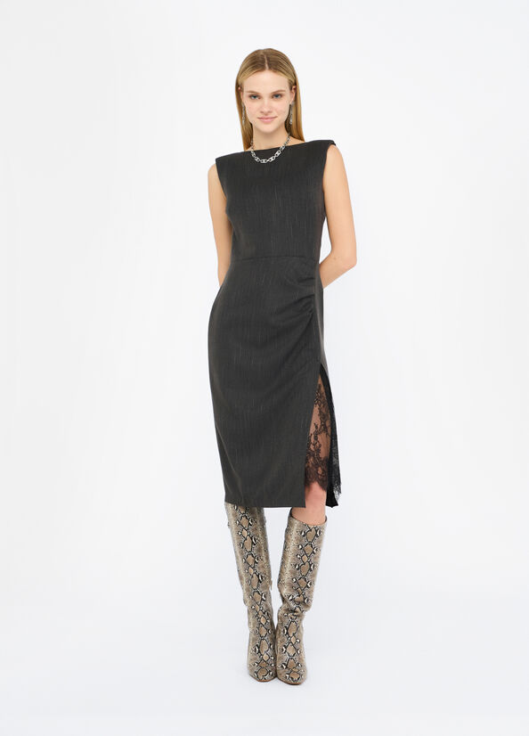 Abito a tubino midi gessato in misto viscosa stretch, spacco laterale con inserto in pizzo. Chiusura con zip e bottone a goccia.