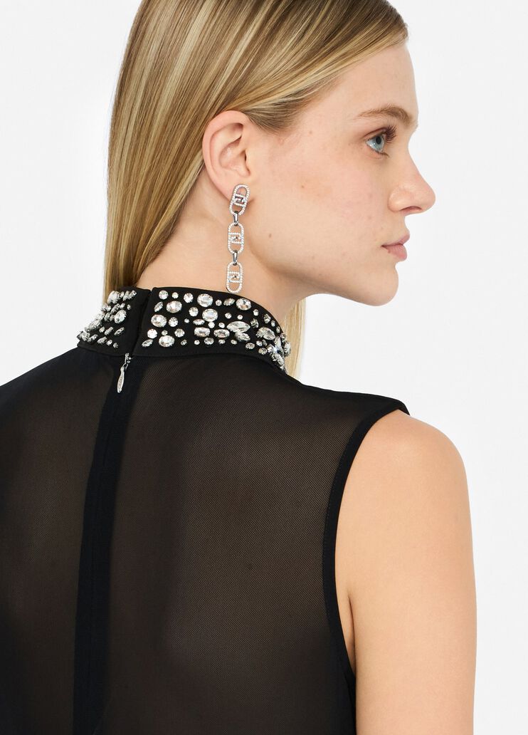 Abito in tessuto tecnico stretch con collo impreziosito da strass. Chiusura con zip dietro.