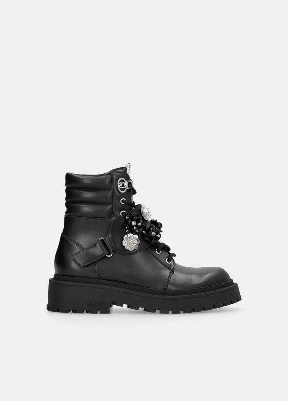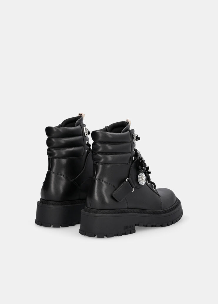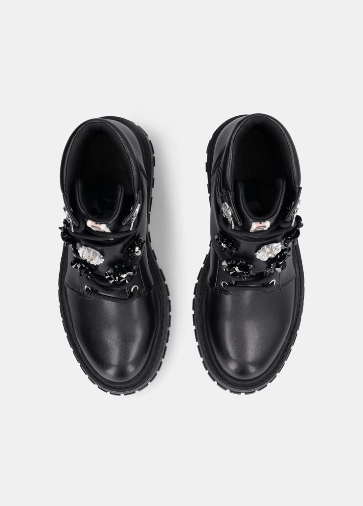Anfibi in pelle con applicazioni gioiello e chiusura con velcro più lacci. Altezza suola: 5 cm. Altezza gambale: 15 cm.