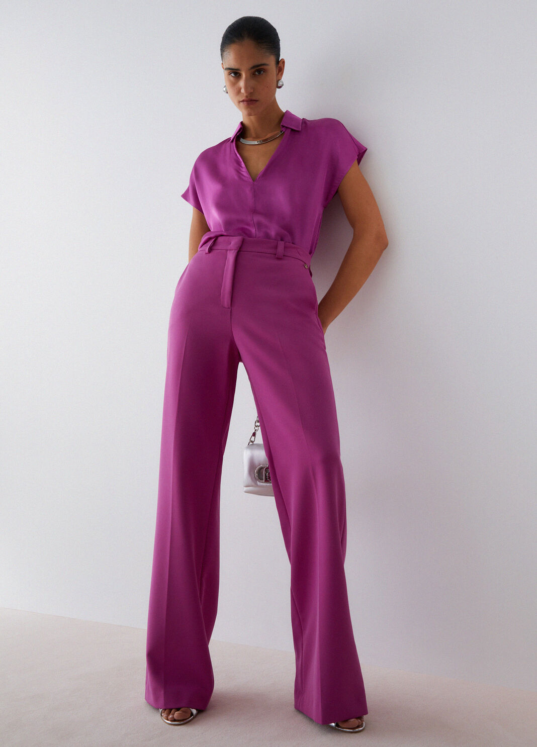 Blusa scollo a V con colletto in viscosa dal fit morbido.