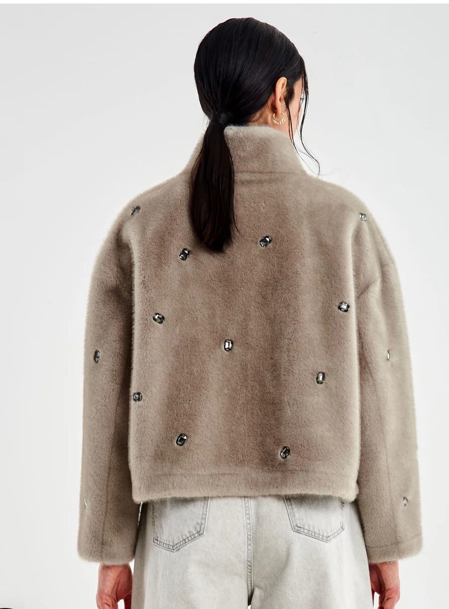 Bomber in eco-pelliccia, collo alto e cristalli applicati. Chiusura con zip. Colore grigio.