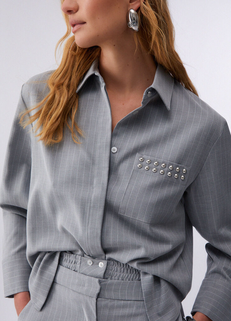 Camicia gessata con tasca borchie applicate. Chiusura con bottoni nascosti.