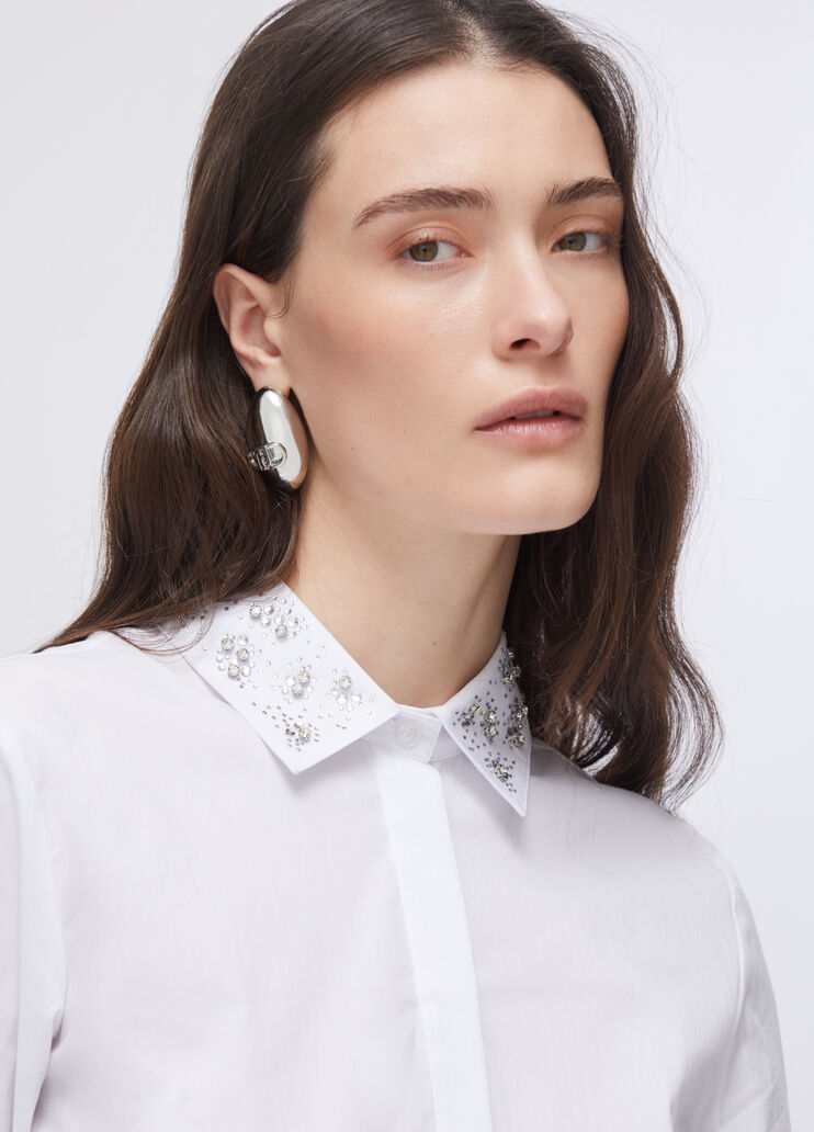 Camicia a maniche lunghe in popeline con colletto impreziosito da ricami gioiello, dal fit slim . Chiusura con bottoni nascosti.