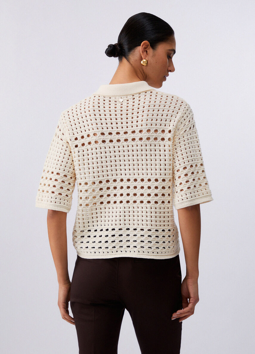 Cardigan cotone in crochet con ricami sul collo. Chiusura con bottoni.