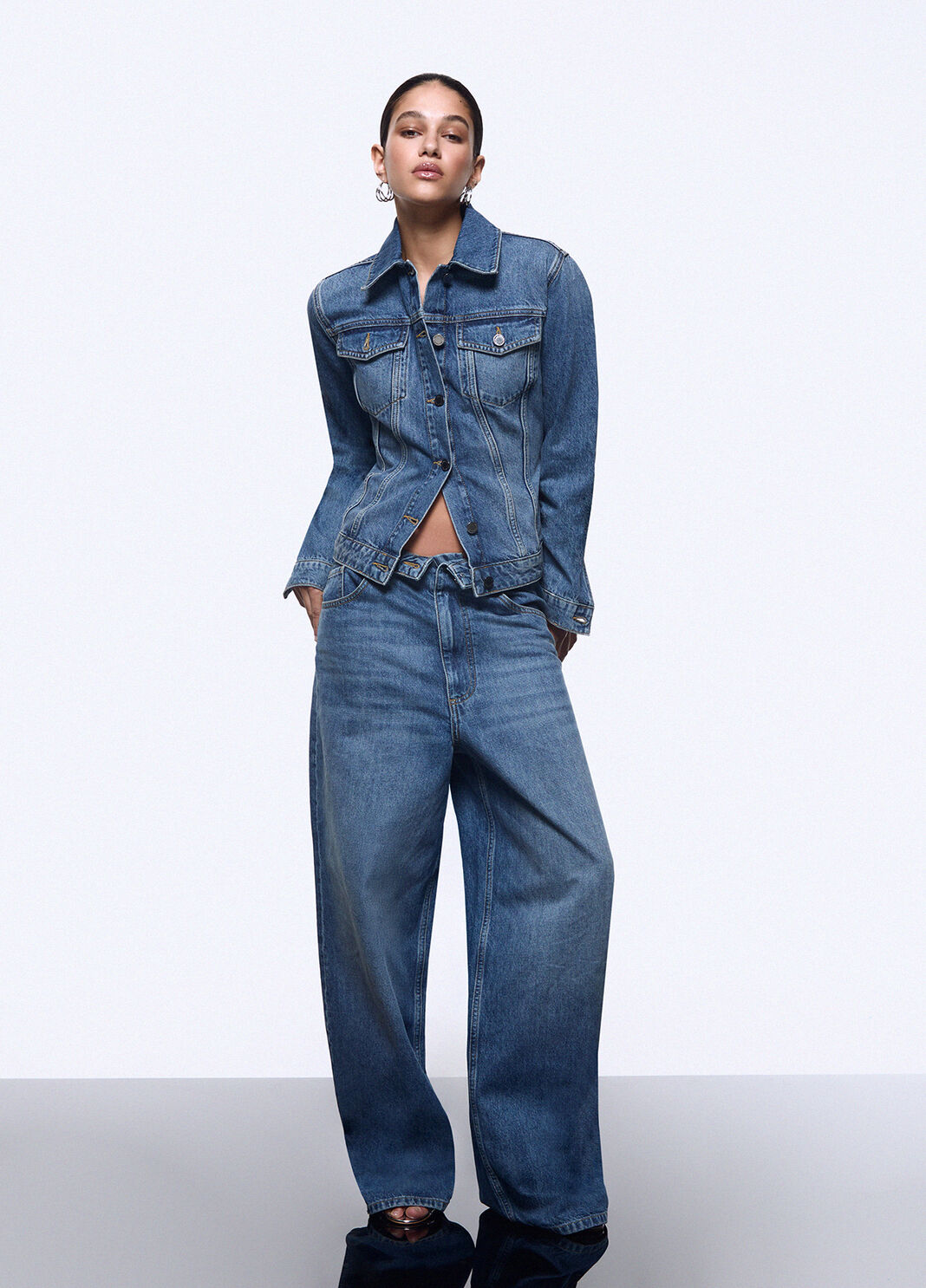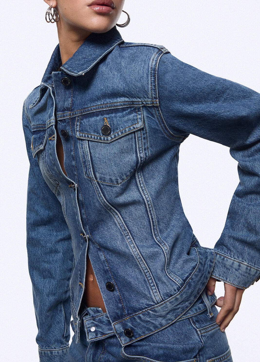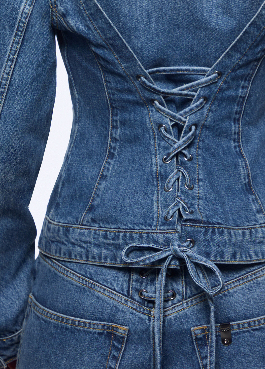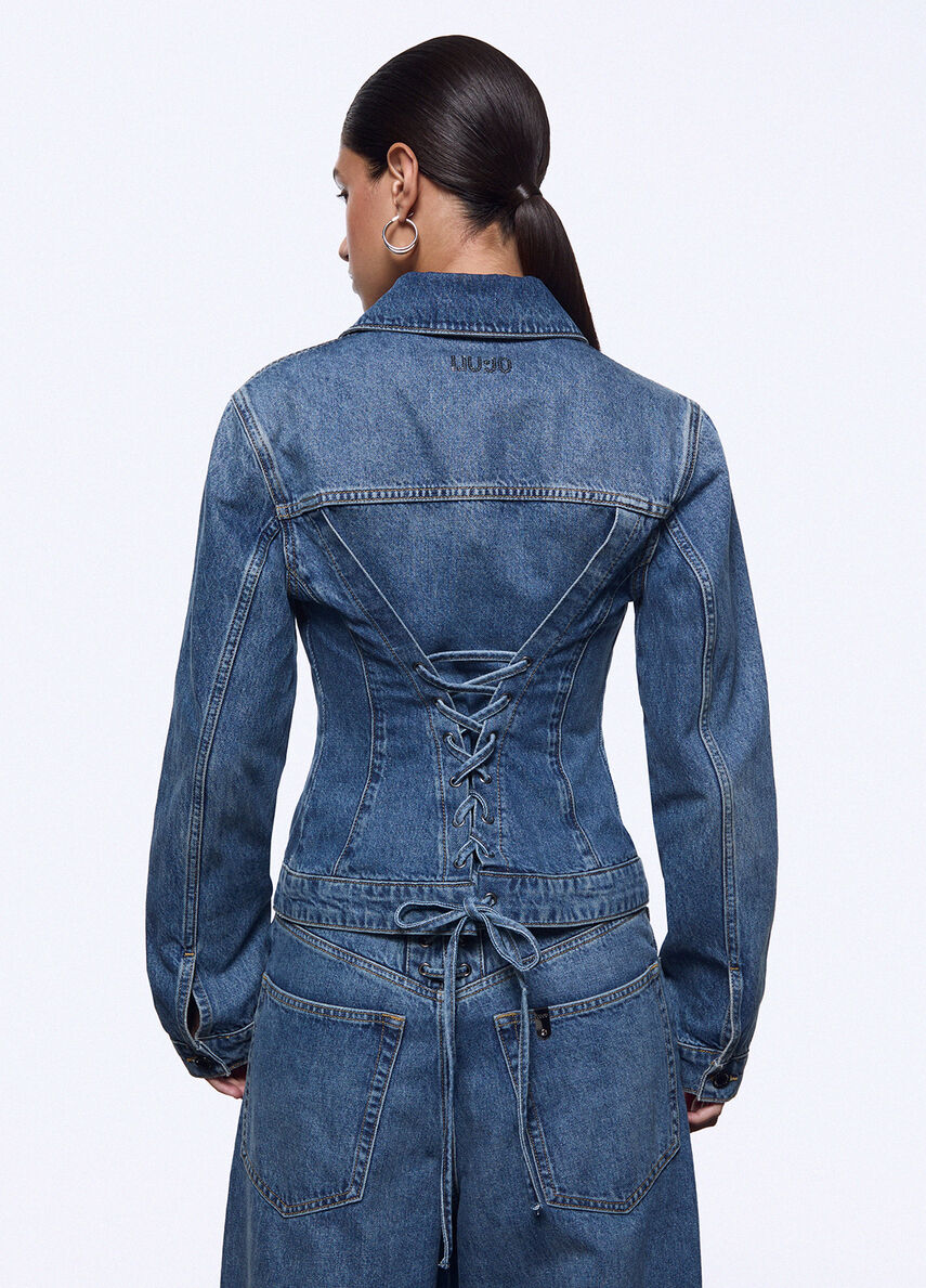 Giubbino in denim no-stretch dal fit slim con stringa intrecciata dietro. Chiusura con bottoni.