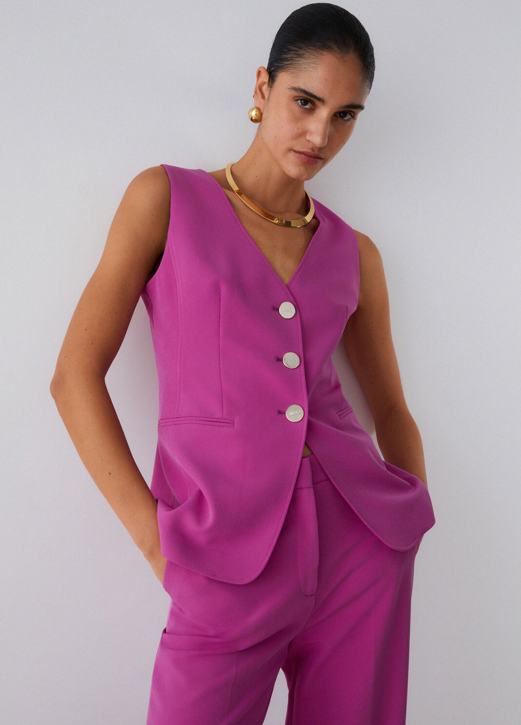 Gilet in tessuto stretch, scollo a V. Chiusura con bottoni.