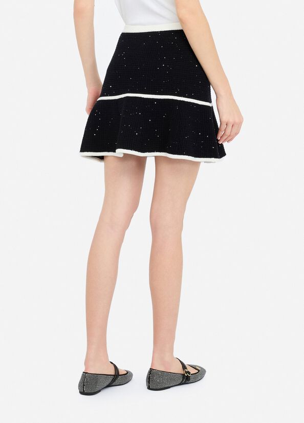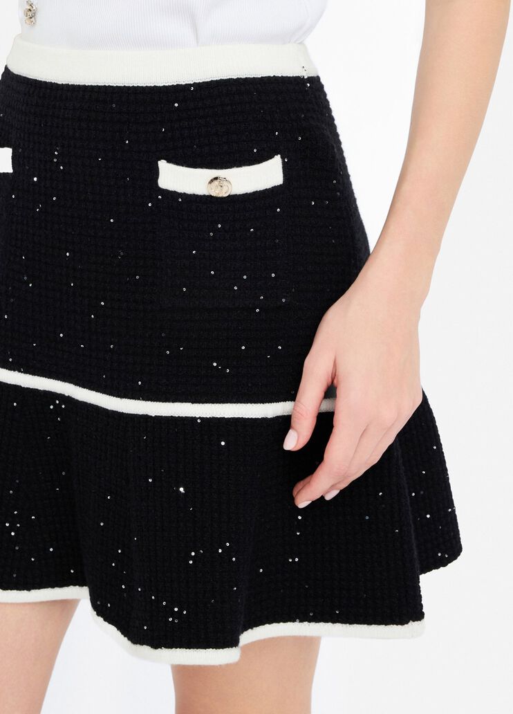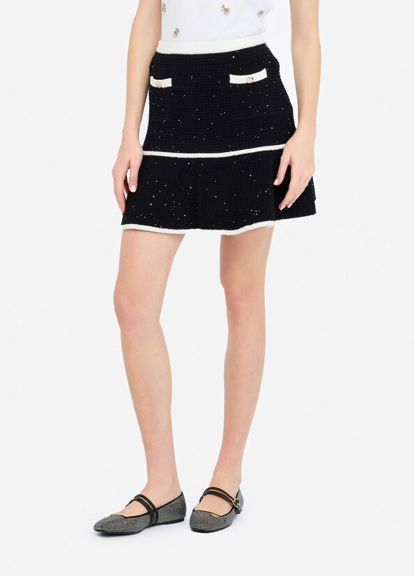 Minigonna in maglia di misto viscosa e lurex, tasche applicate con bottone, vita con elastico. Prodotto “Liu Jo Better”