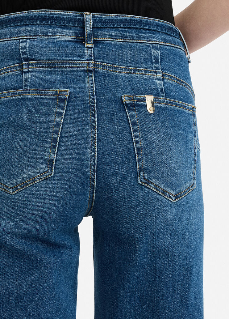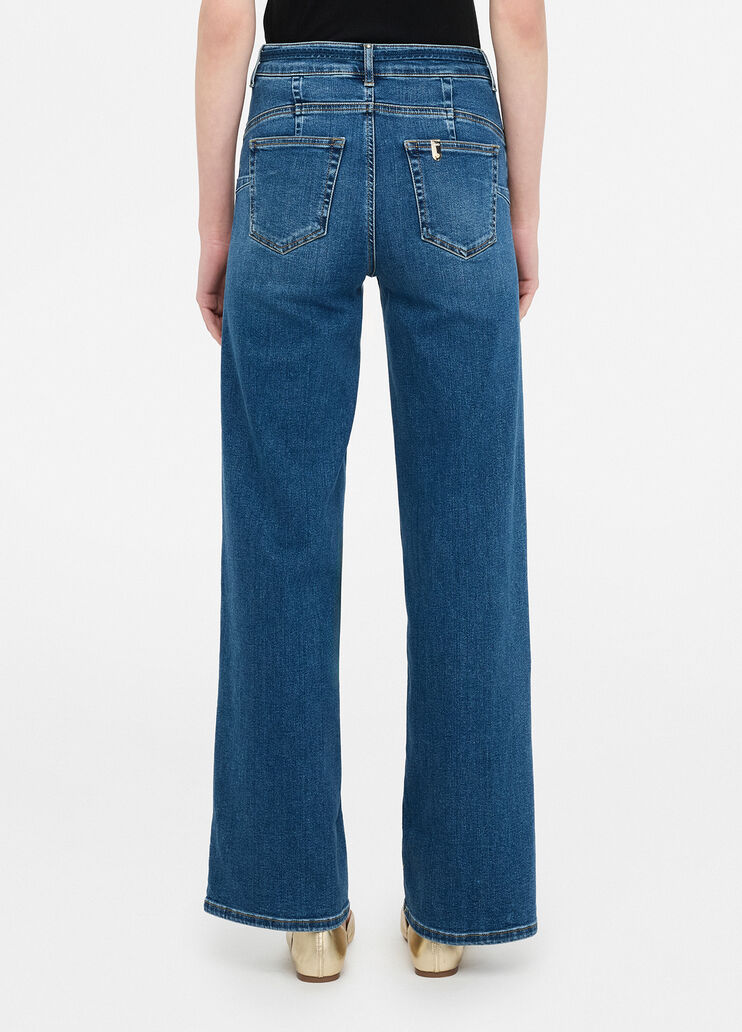 Jeans flare stretch con cintura sur ton in abbinamento. Chiusura con zip.