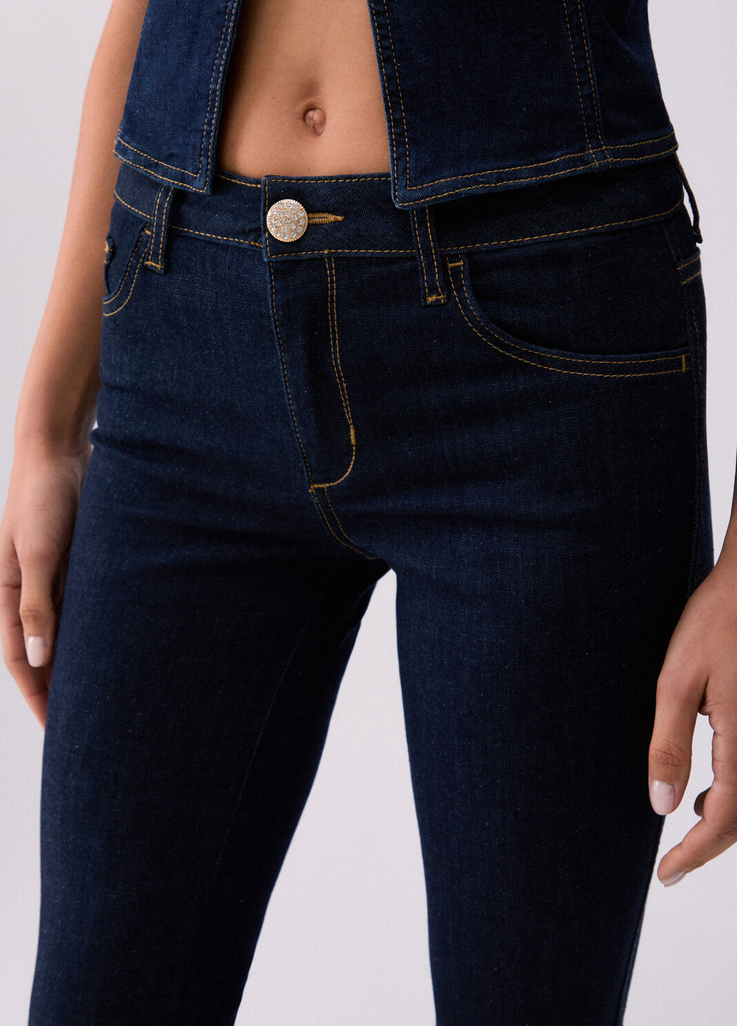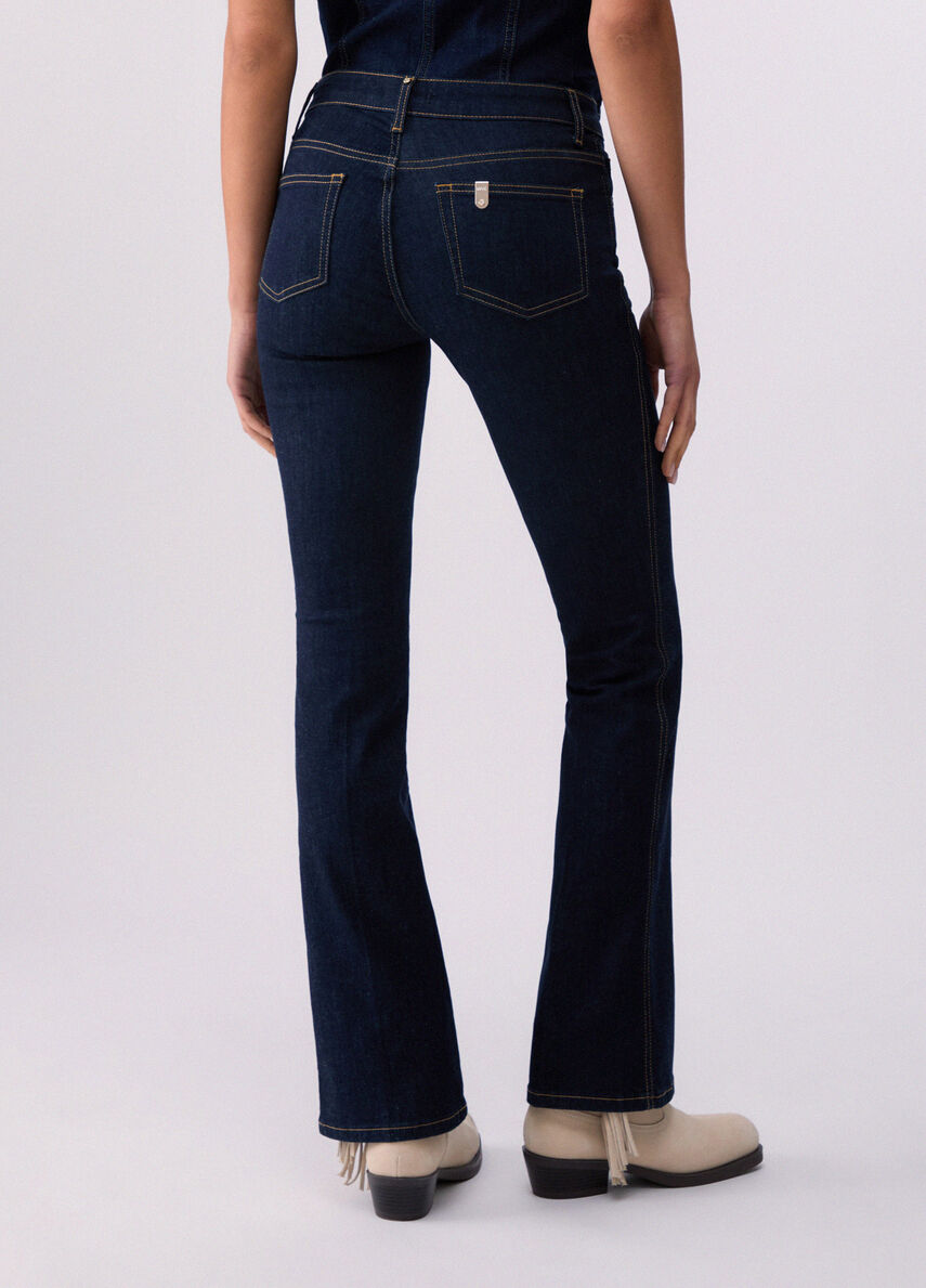 Jeans Boot Cut stretch, lavaggio scuro stonewash a vita alta gamba asciutta leggermente svasata sul fondo. Chiusura con zip e bottone.