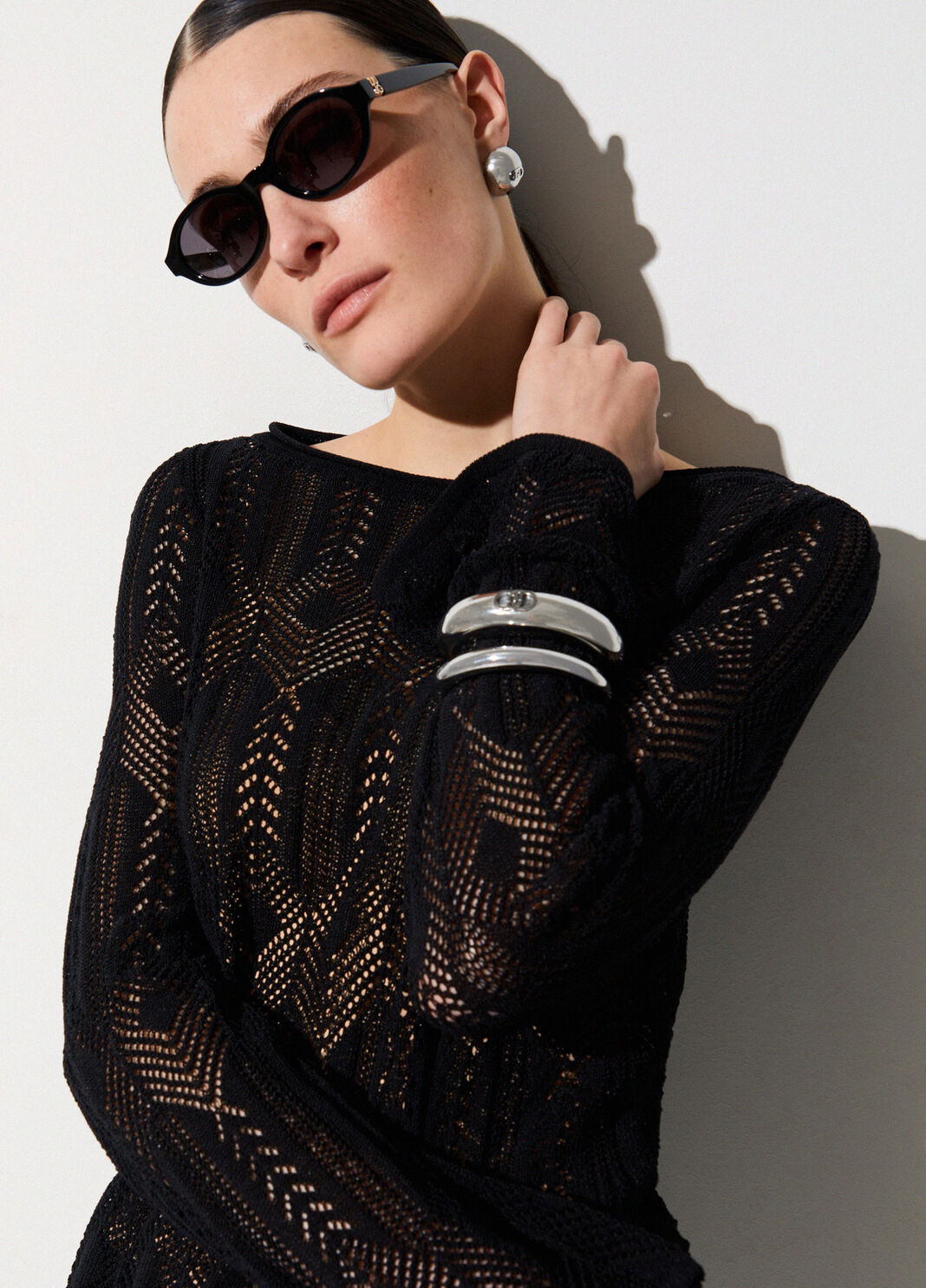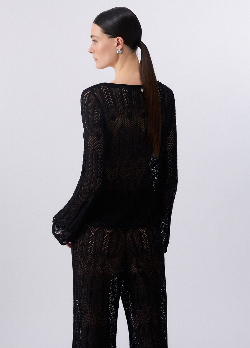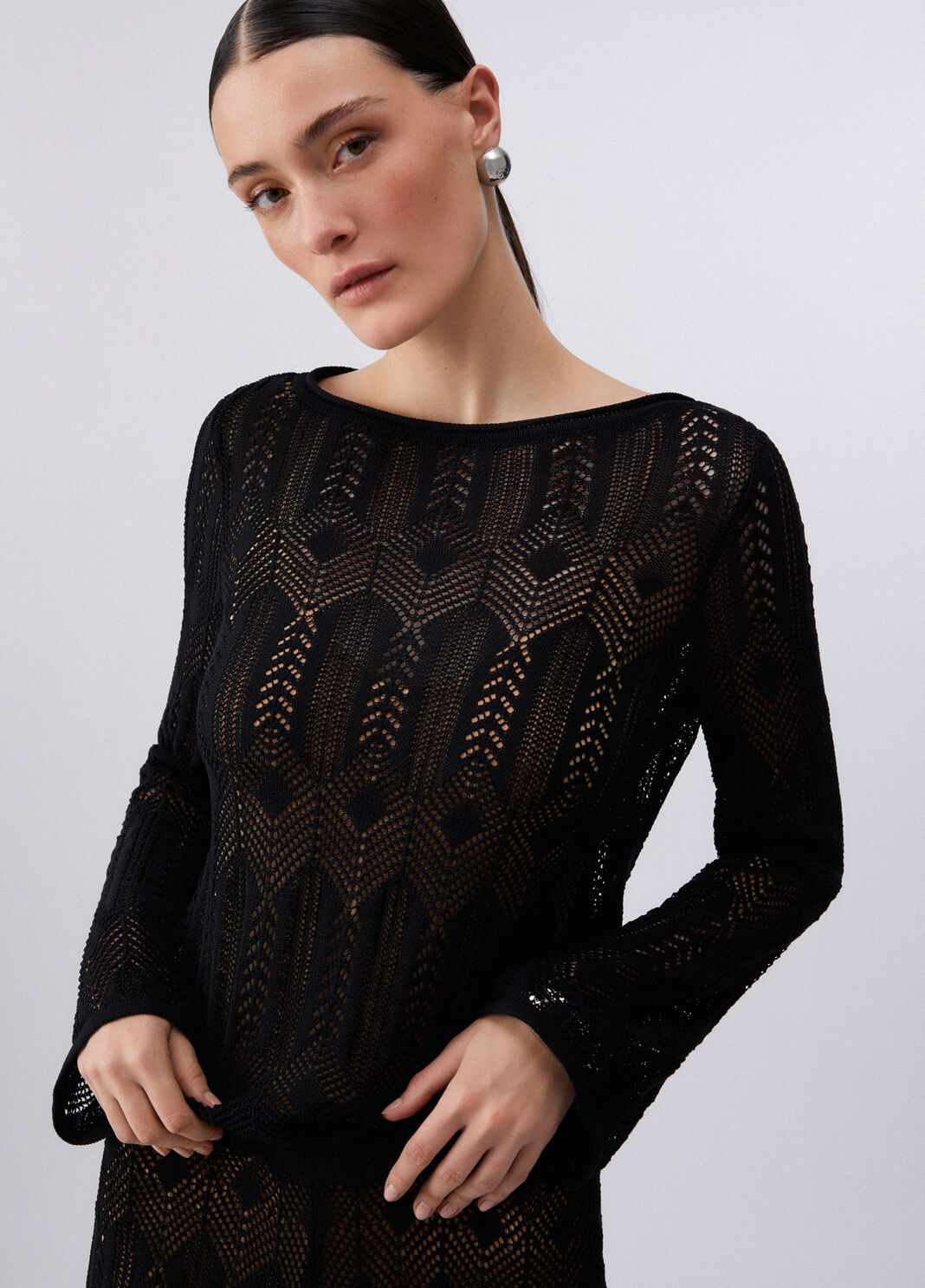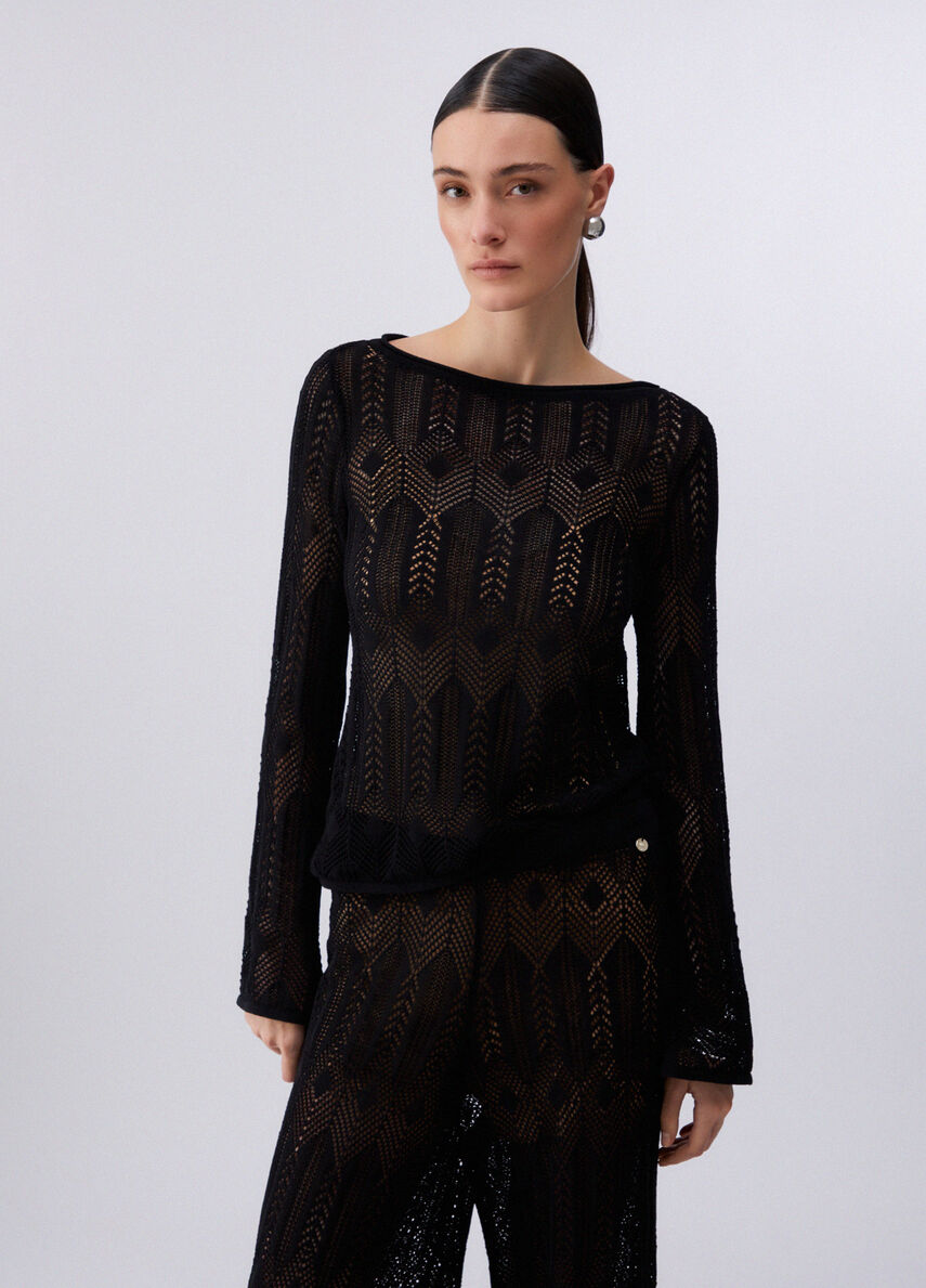 Maglia traforata con scollo a barchetta a maniche lunghe e polsi flare. Canotta in dotazione.