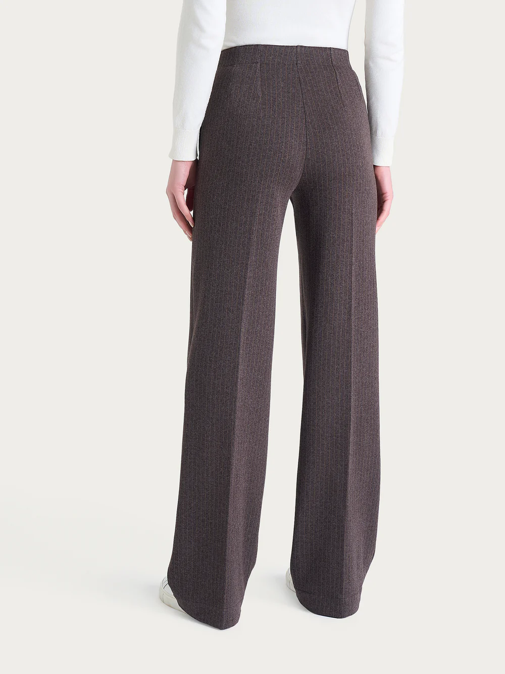 Pantalone gessato con gambale morbido, comodo elastico in vita con tasche.