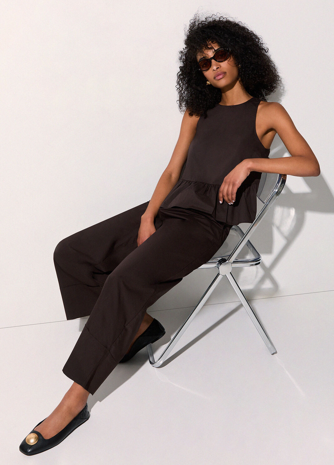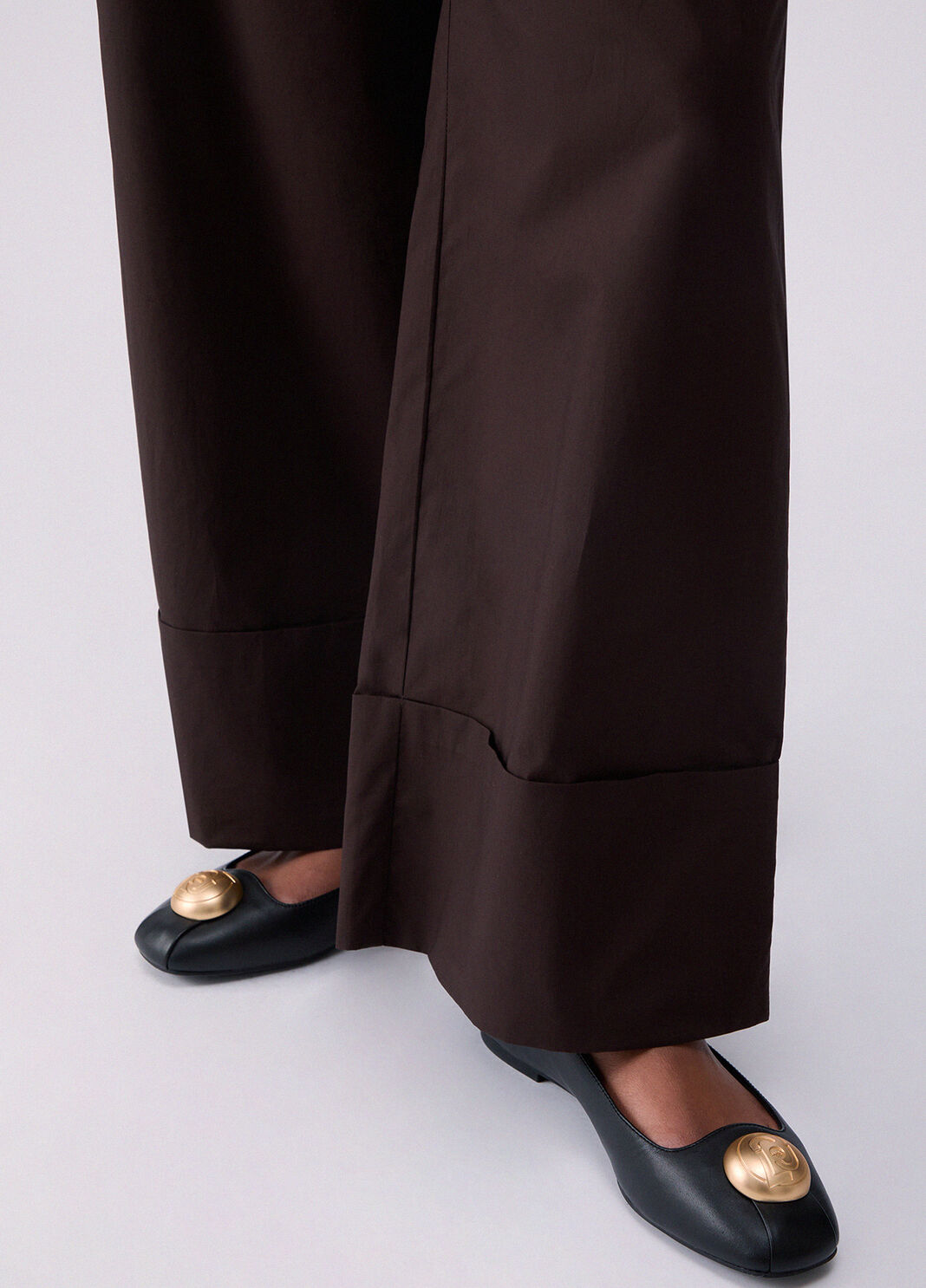 Pantaloni in popeline con pence, gambale flare, chiusura con zip.