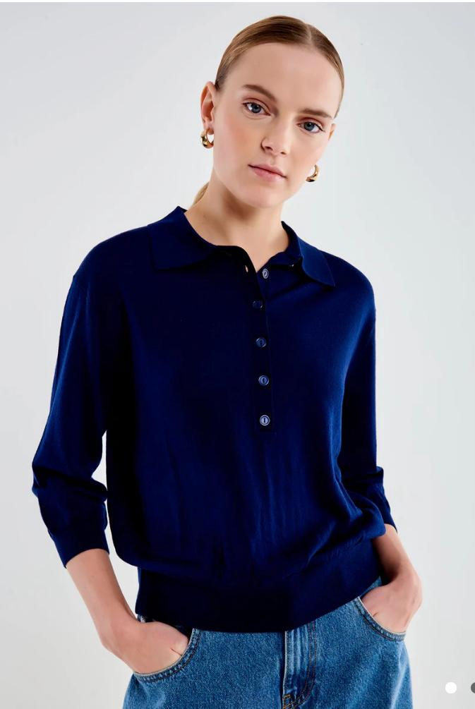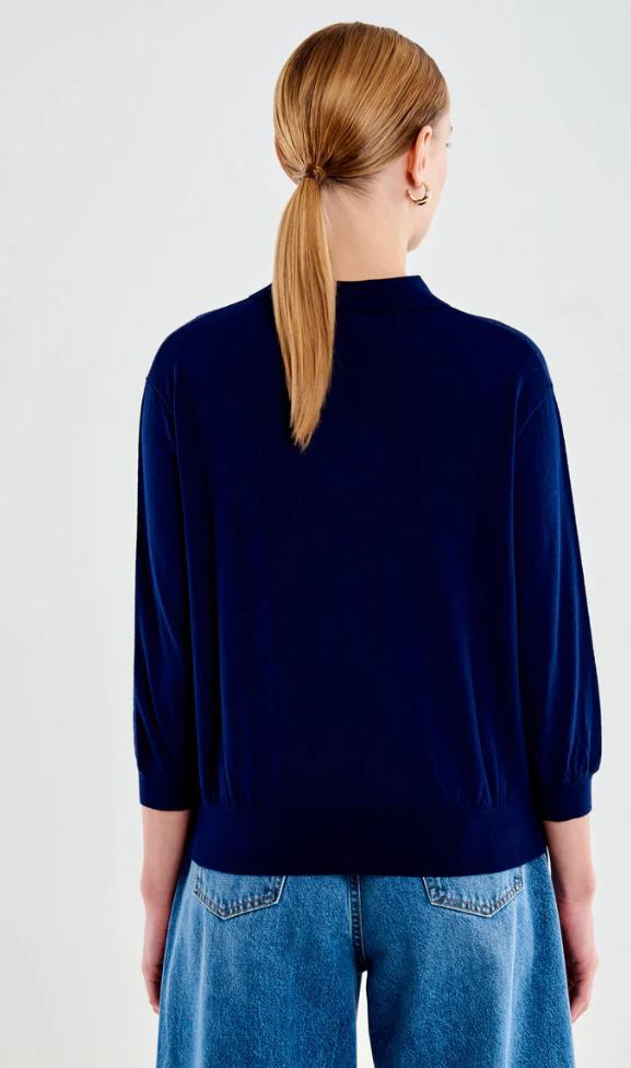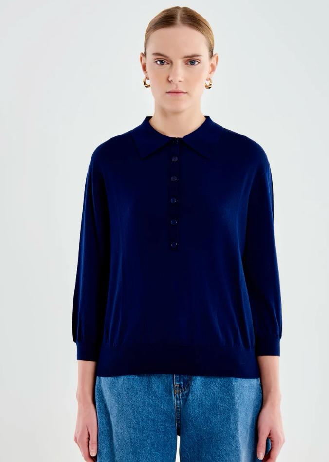 Polo in maglia a maniche tre quarti con colletto. Chiusura frontale con bottoncini. Finiture a costine.