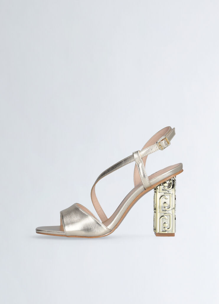 Sandalo con effetto laminato e cinturino regolabile. Tacco a colonna con logo all over altezza: 10,5 cm.