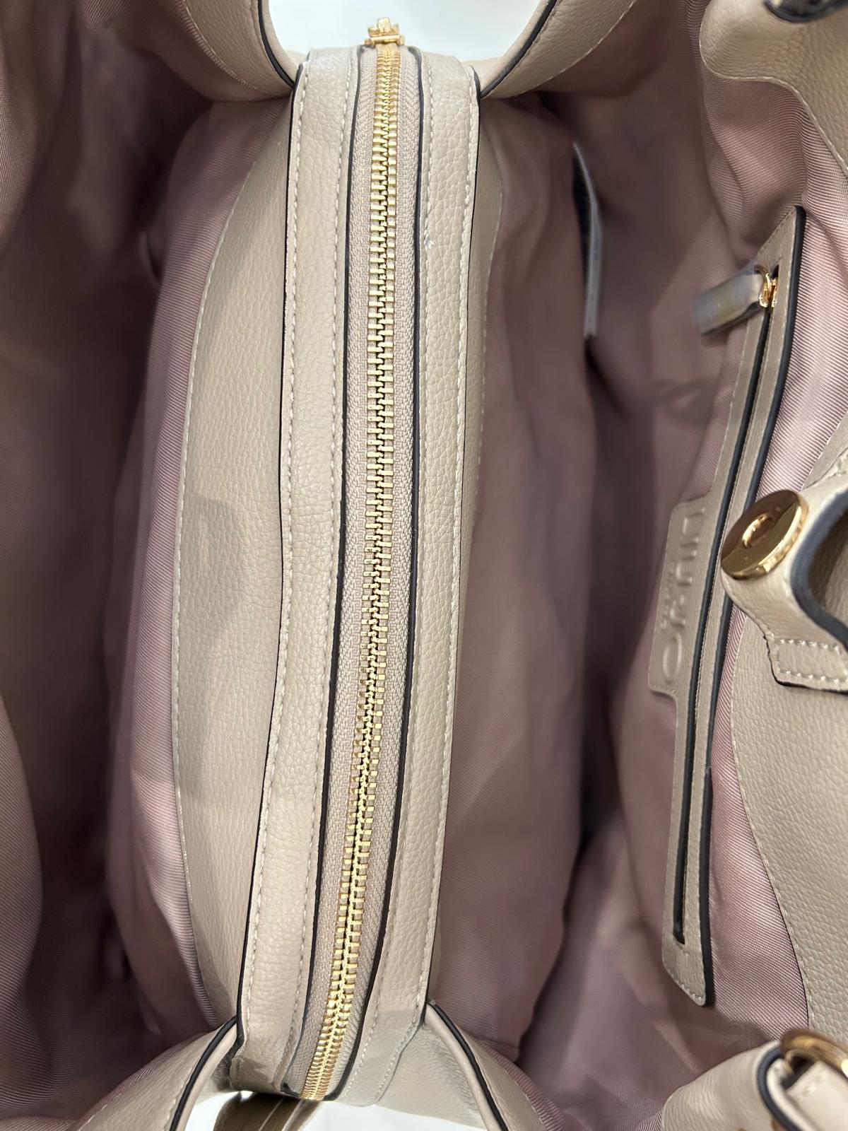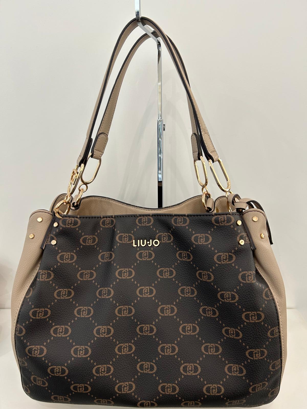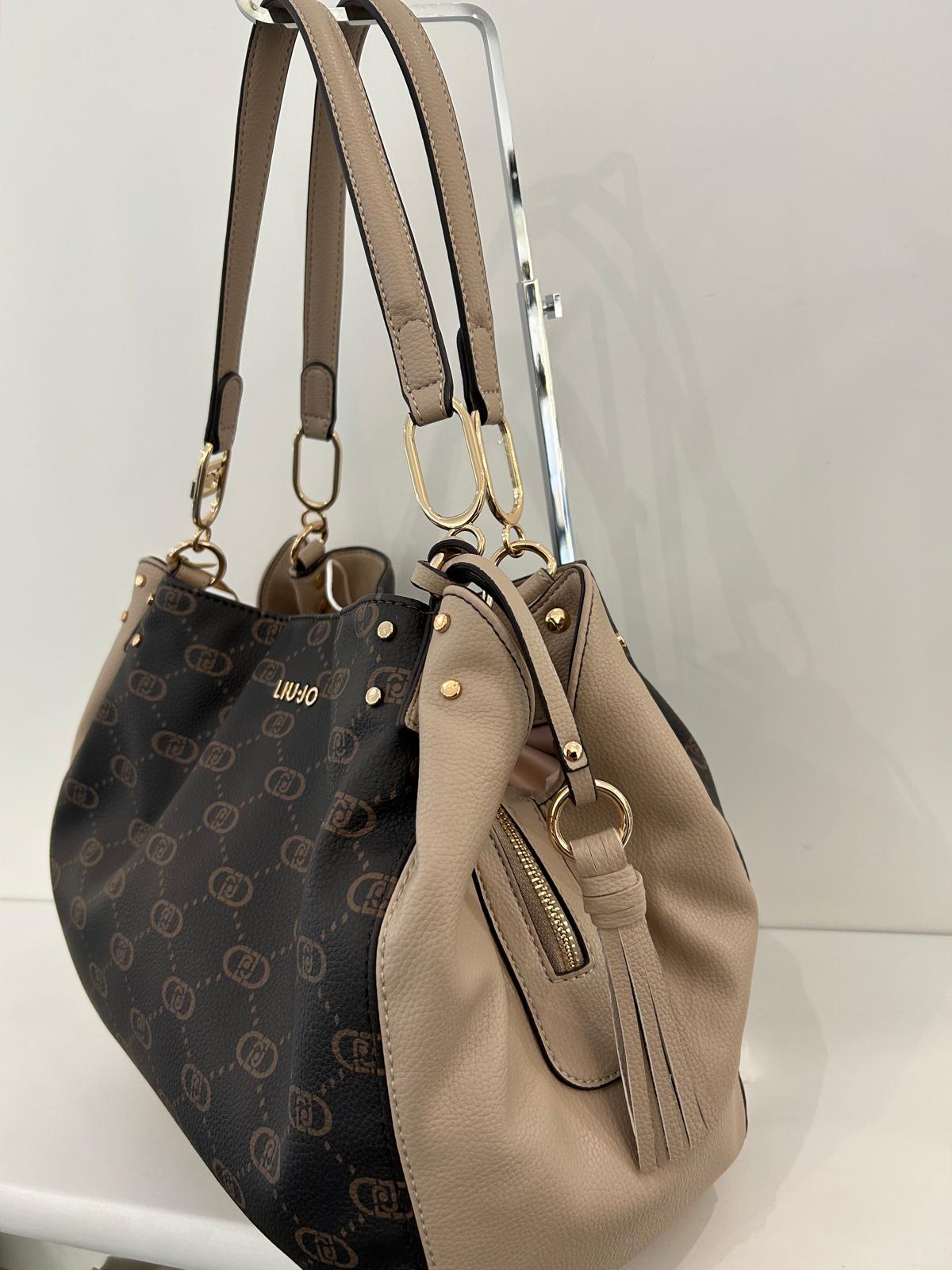 Shopping bag media effetto bottalato con stampa logo e charm in nappina rimovibile. Comodi manici a spalla,  due scomparti  interni con chiusura magnetica e uno con zip. Misure: 32 x 14 x 26 cm.