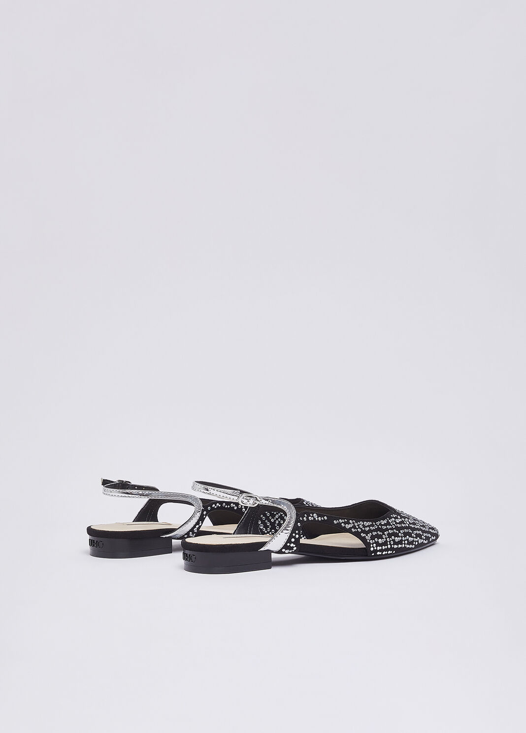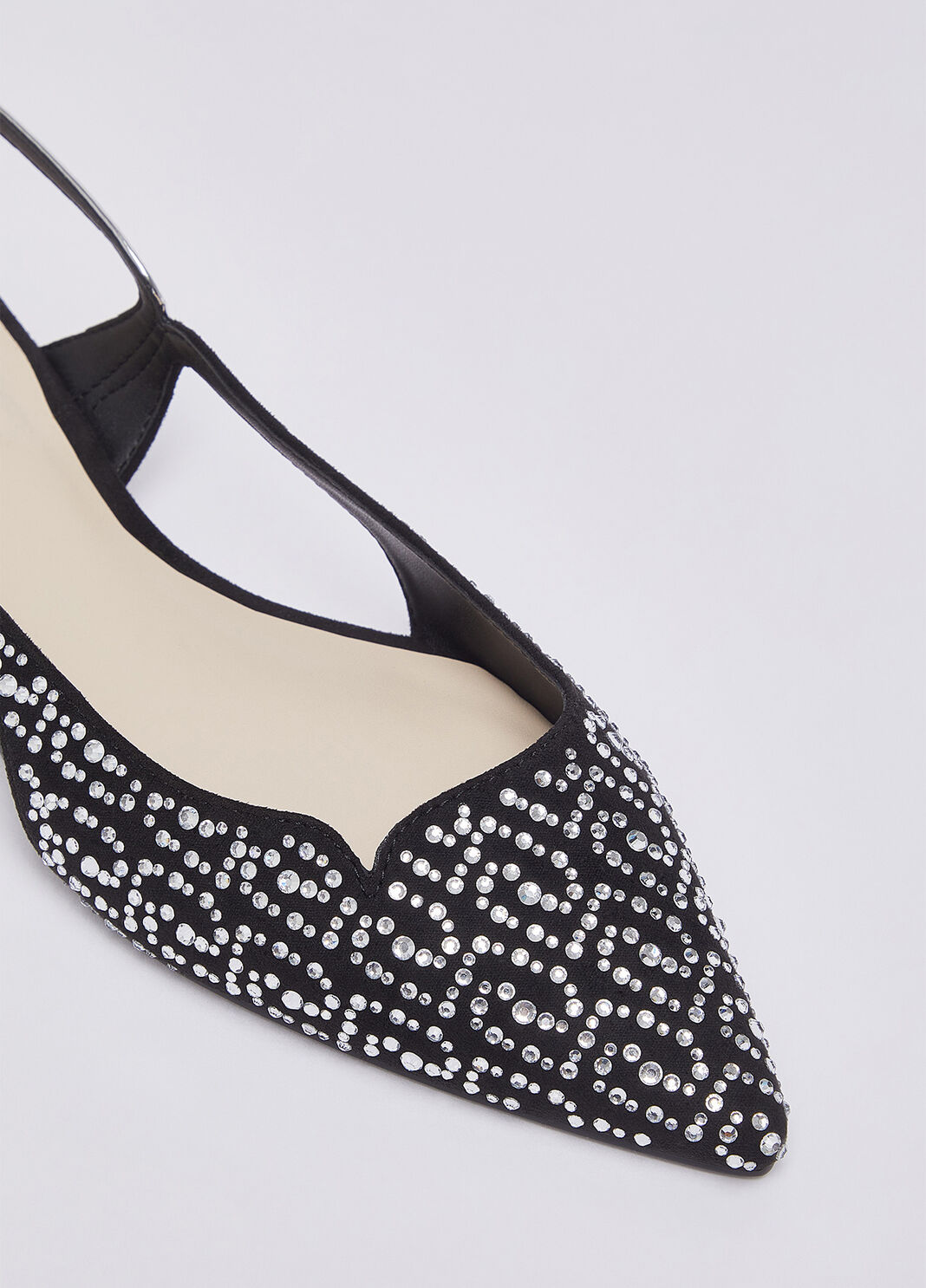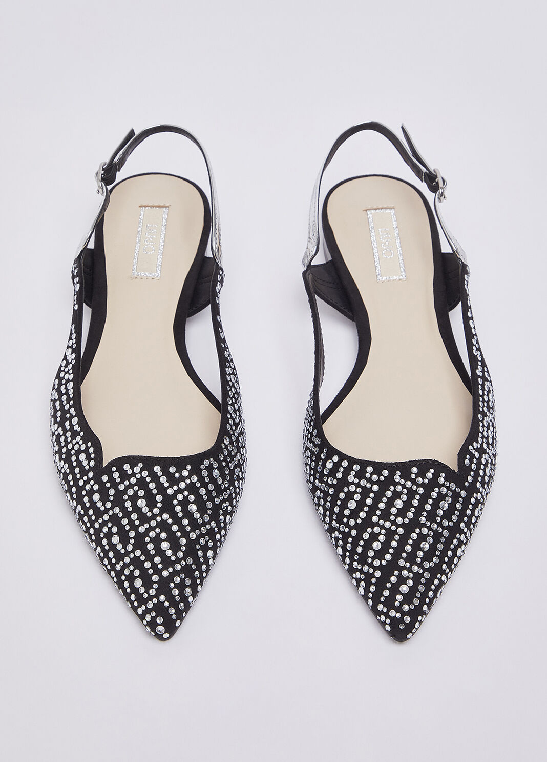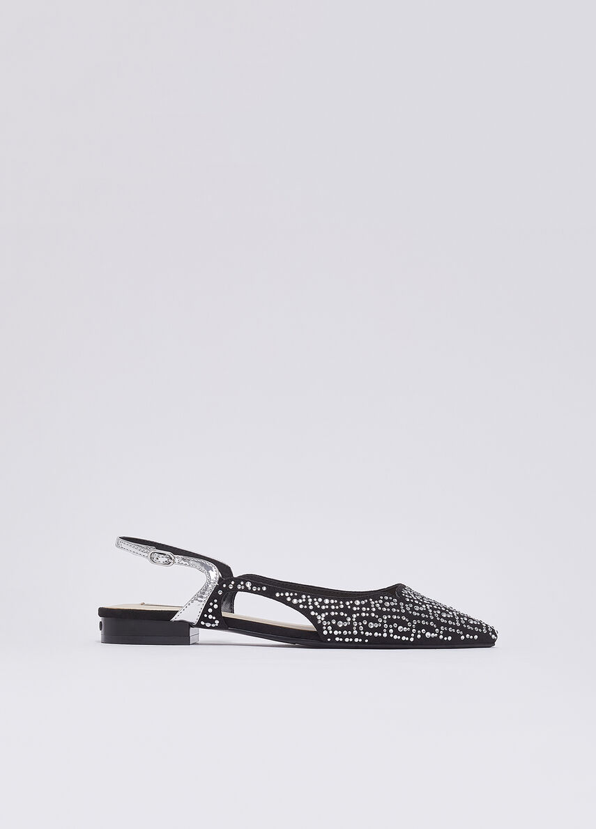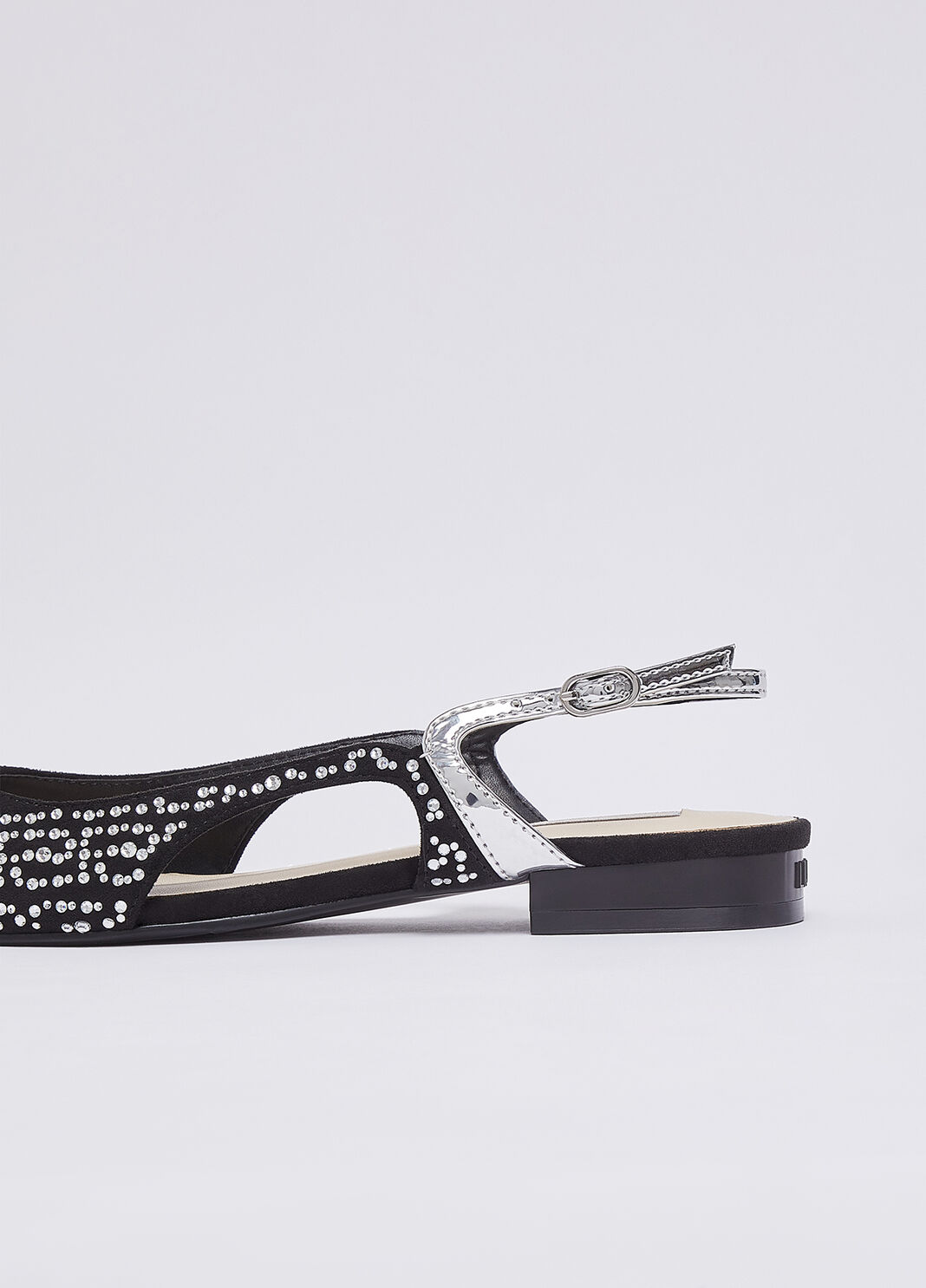 Slingback con tomaia in strass monogram, cinturino laminato a specchio con fibbia regolabile, punta affusolata e tacco flat logato. Altezza tacco: 1,5 cm.