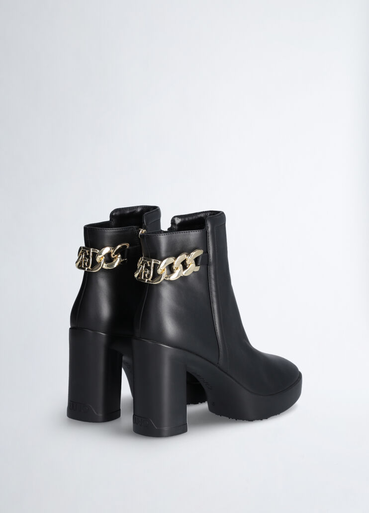 Tronchetto con comodo plateau in pelle e catena color oro, chiusura con zip. Altezza tacco: 9,5 cm. Altezza gambale: 10 cm.